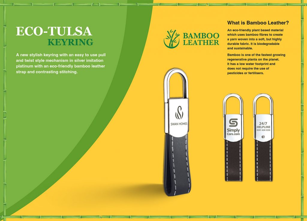 A new stylish keyring with an easy to use pull and twist style mechanism in silver imitation platinum with an eco-friendly bamboo leather strap and contrasting stitching.