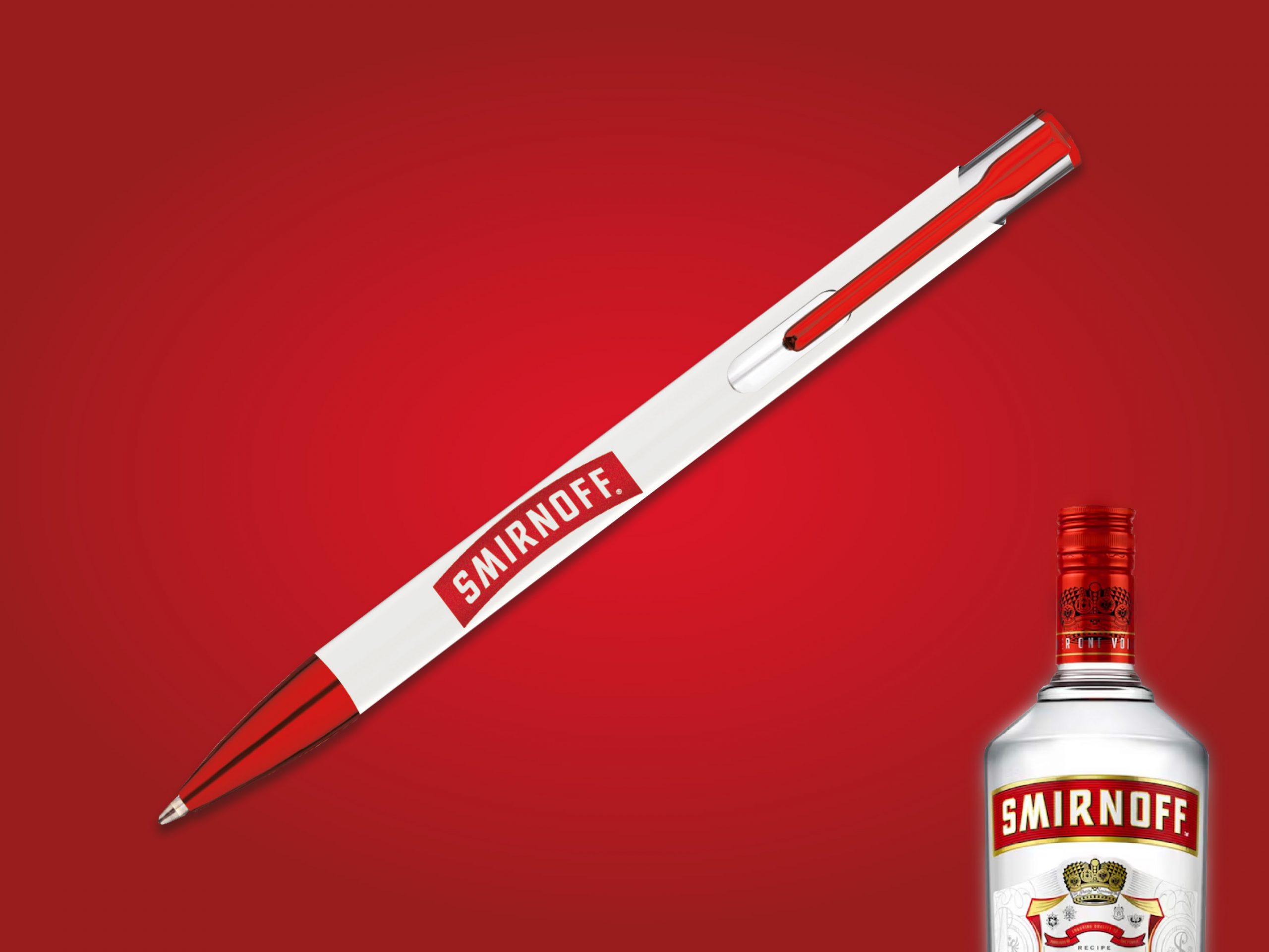 An eye catching colourful pen which accentuates the distinctive red colour used in the brand identity.